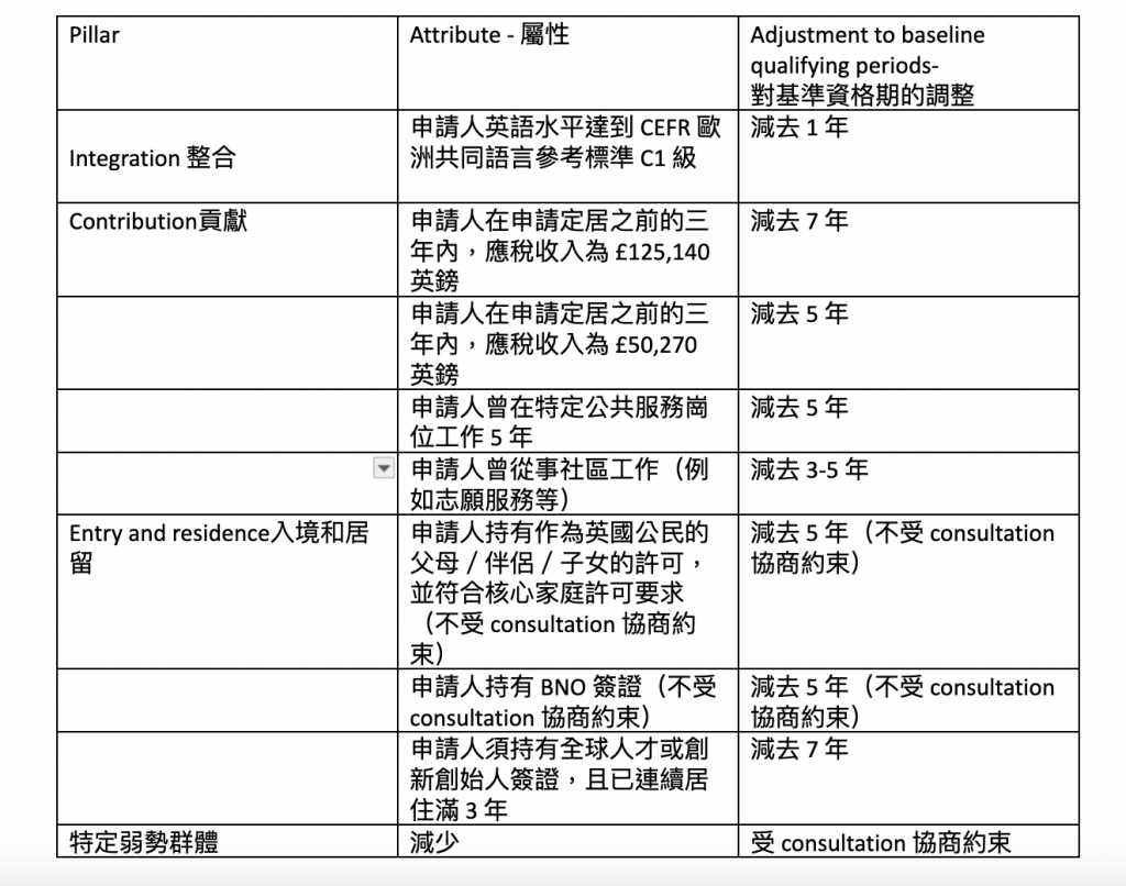 現行的「長期居住」途徑將被取消;取而代之的是,申請人的基準資格期將根據其貢獻及融入社會的情況進行調整(延長或縮短)。